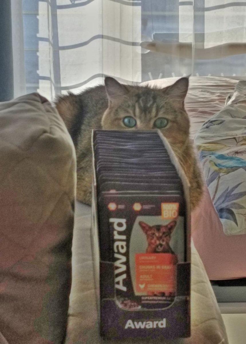 Хороший влажный корм, котик кушает хорошо! Заказала и через 3 дня забрала. Очень удобно и цена самая выгодная! Привезли в фирменной коробке Award. Годен до 20.11.25, изготовлен 20.11.23.