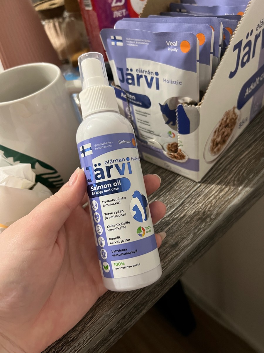 Решили попробовать еще лососевое масло добавлять к сухому корму, посмотрим.