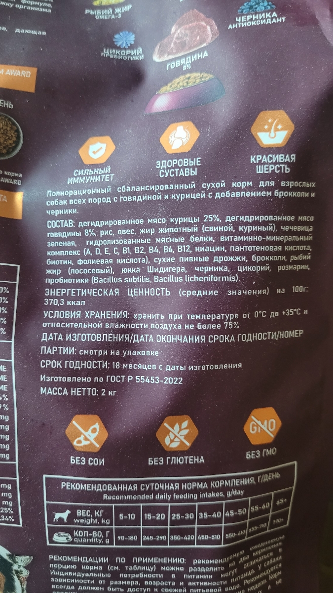 Пусть будет немного пафоса, но я рад, что наши российские производители наконец начали выпускать такие сухие корма. Покупаю несколько месяцев, но мнение уже сложил. Тут все плюсы взаимосвязаны. Мяса много, в составе есть и свежее. Всякие полезные витамины и жирные кислоты предусмотрены. Ничего лишнего типа красителей и ГМО понятно что нет, этого и не должно быть в корме такого класса. Собак себя чувствует хорошо. У меня он уже пять лет, это не просто собака в доме, это член семьи. Мы например много бегаем, можем до 20 км протрусить в отдельные дни. И все вместе. Выглядит парень отлично, ничем не болеет. Что еще я могу пожелать собаке? Чтобы о ней всегда было кому позаботиться. Корма опробованы, лучше вряд ли найду, берем эти. И мне забот как хозяину меньше, насыпал и готово. Из нагрузки исходя, иногда добавляю чуть больше нормы. Тут все индивидуально.