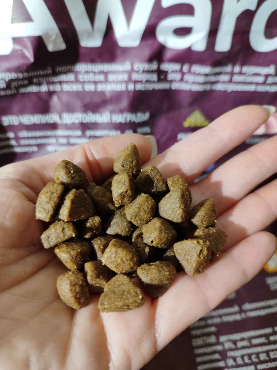Данный корм заказывали на пробу в маленькой упаковке, теперь решили большую взять, собакам вроде он понравился. Гранулы приемлемого размера, как раз для средних собак хороши, корм не пересушен, жирненький, не вонючий. В общем собаки съели, без восторга, но все таки. Будем надеяться, по здоровью тоже вопросов не будет.